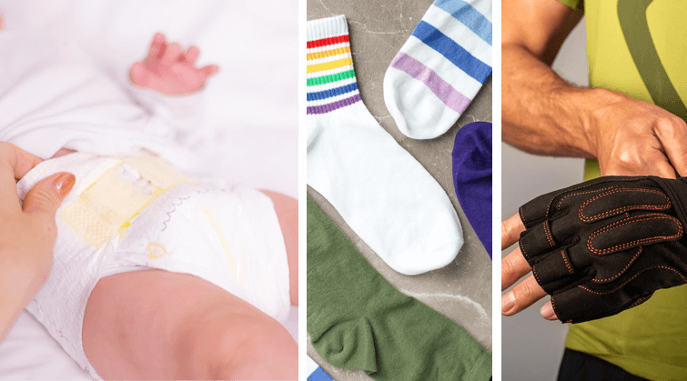 نخهای لاستیکی در صنایع مختلفی از جمله پوشاک ورزشی و لباسهای زیر کاربرد دارند. بهدلیل ویژگیهای منحصر بهفرد و کاربردهای گسترده نخهای لاستیکی، محصولاتی مانند جوراب و محافظ قوزک پا نمونههایی بارز از استفاده این نخها هستند که برای ایجاد کشش و انطباق با پا طراحی شدهاند.